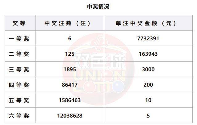 一等奖中奖情况:内蒙古1注,辽宁1注,上海1注,安徽1注,河南1注,新疆1注,共6注,单注奖金773万。